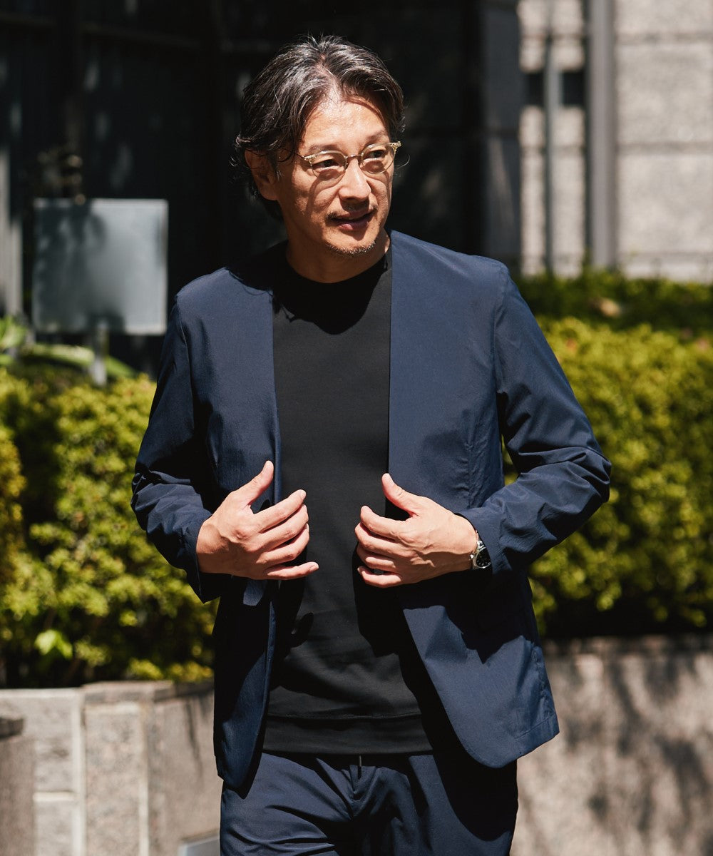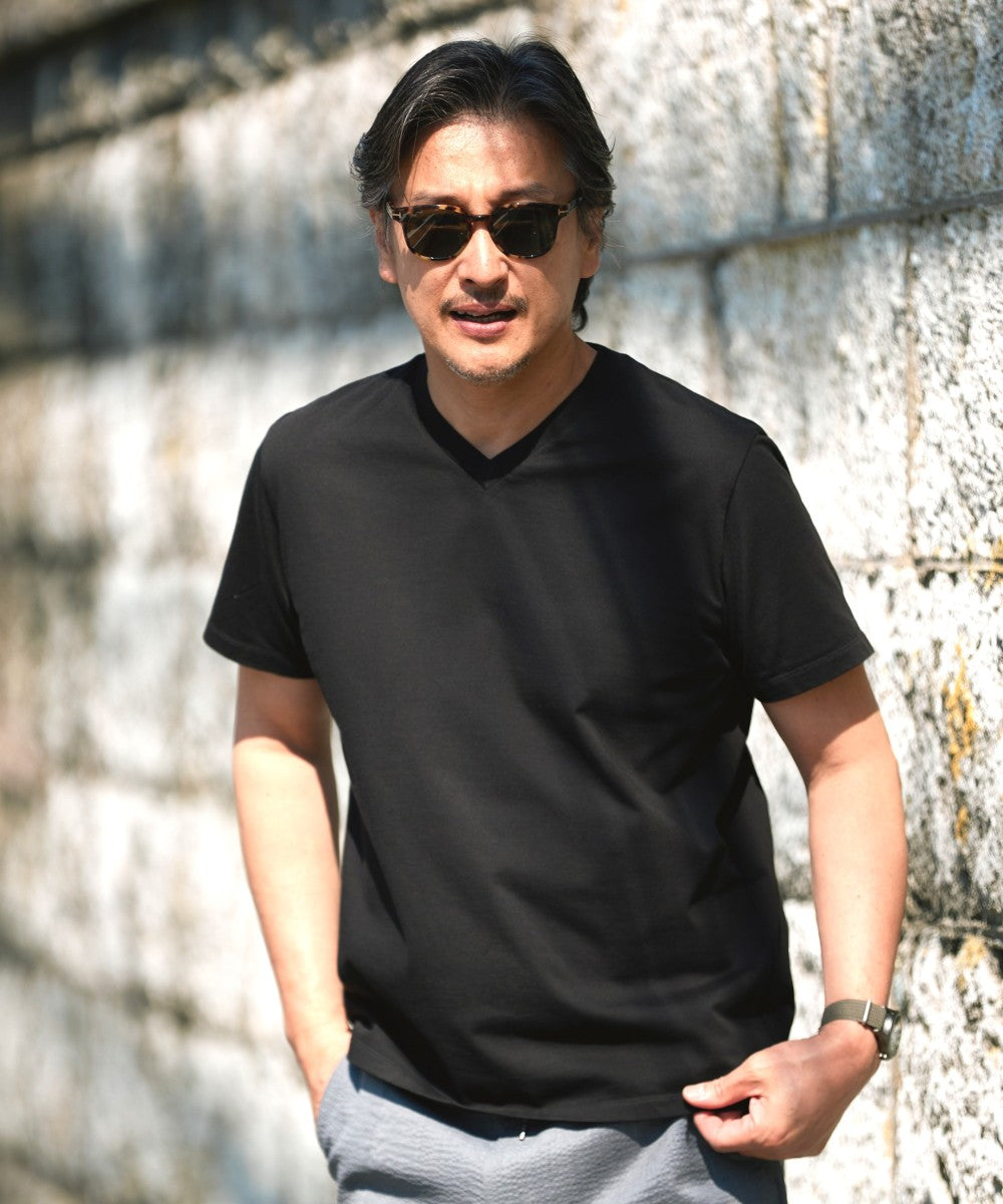 細番手のスーピマコットンと高伸度ポリエステルを交編し、ポリエステル自体のナチュラルストレッチとコットン特有の風合いが融合されたハイブリット素材。デイリーな家庭洗濯に対応、さらにはハンガーにもかけられるタフな糸&編地設計。